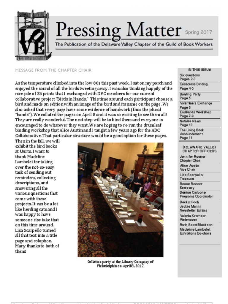 Page 2 Delaware Valley Chapter of the Guild of Book Workers PRESSING MATTER Spring 2017 Page 11 Delaware Valley Chapter of the Guild of Book Workers PRESSING MATTER Spring 2017