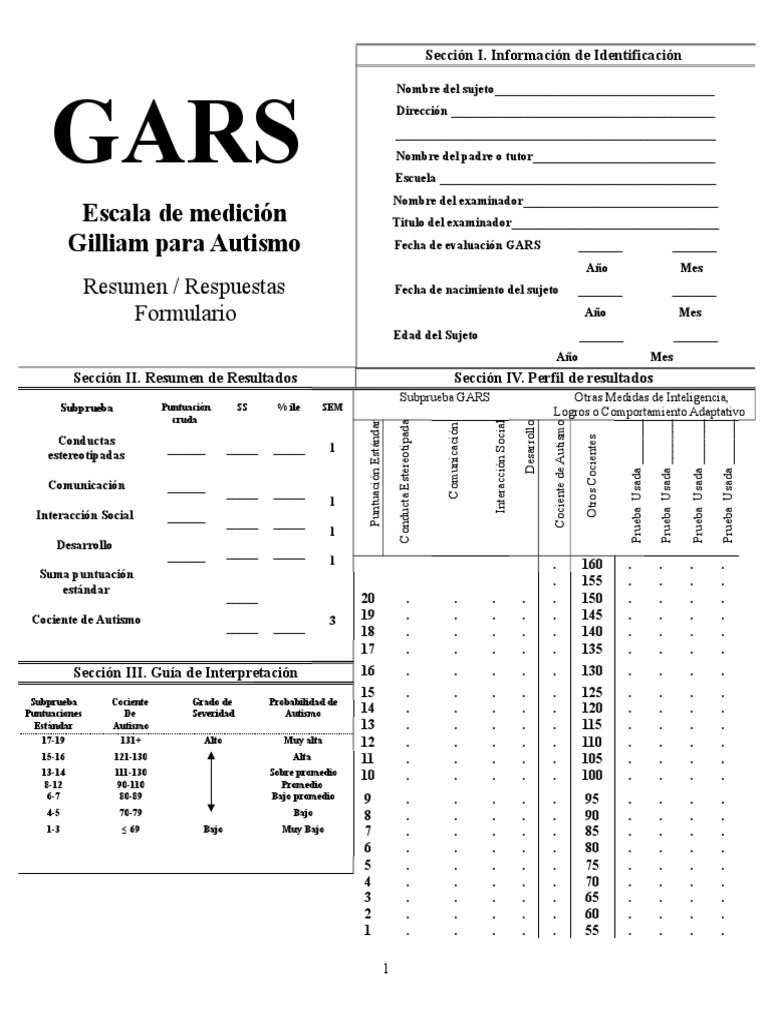 Nombre del sujeto___________________________________ Dirección __________________________________________ ___________________________________________________ Nombre del padre o tutor_____________________________ Escuela ____________________________________________ Nombre del examinador_______________________________ Titulo del examinador_________________________________ ec!a de e"aluación GARS _______ _______ A#o $esec!a de nacimiento del sujeto _______ _______ A#o $es Edad del Sujeto _______ _______ A#o $es