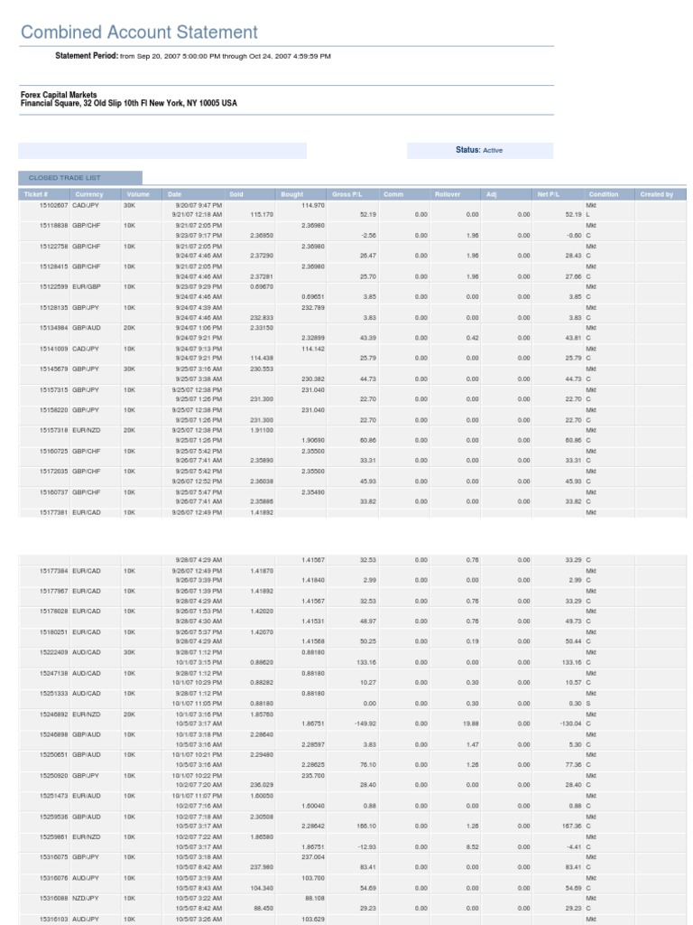 Ticket # Currency Volume Date Sold Bought Gross P/L Comm Rollover Adj Net P/L Condition Created by