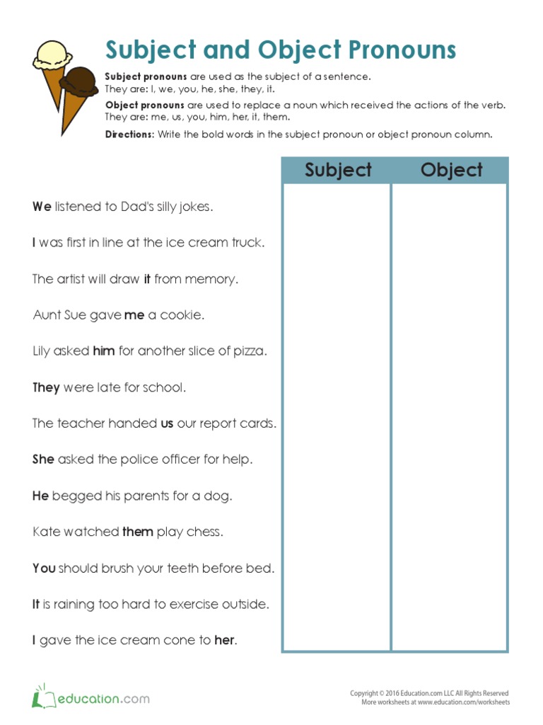 Directions: Write the bold words in the subject pronoun or object pronoun column.