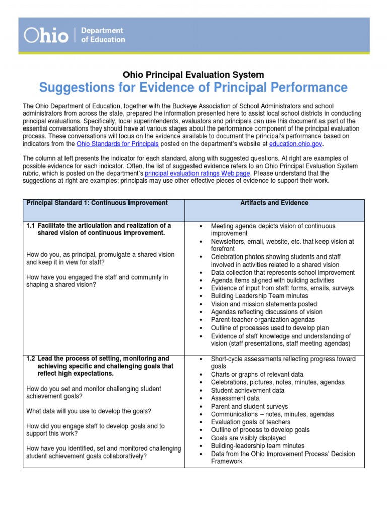 possible evidence for each indicator. Often, the list of suggested evidence refers to an Ohio Principal Evaluation System