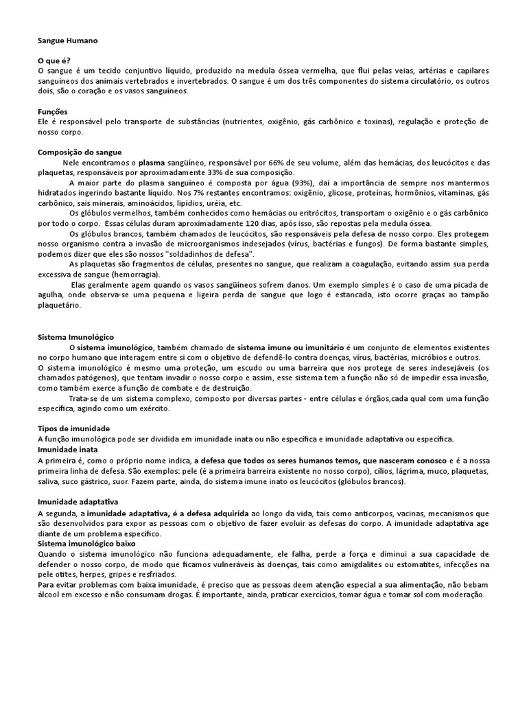 Nele encontramos o plasma sangüíneo, responsável por 66% de seu volume, além das hemácias, dos leucócitos e das