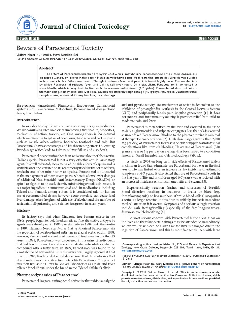 Citation: Vidhya Malar HL, Mary Mettilda Bai S (2012) Beware of Paracetamol Toxicity. J Clinic Toxicol 2:142. doi:10.4172/2161-0495.1000142