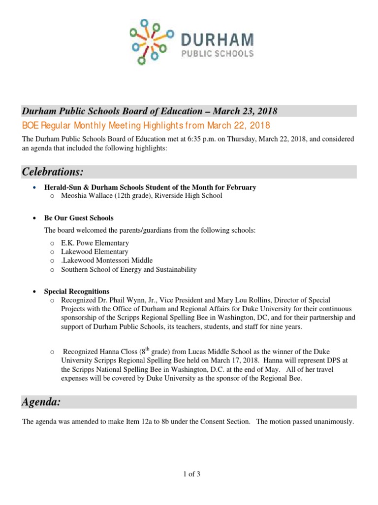 The Durham Public Schools Board of Education met at 6:35 p.m. on Thursday, March 22, 2018, and considered