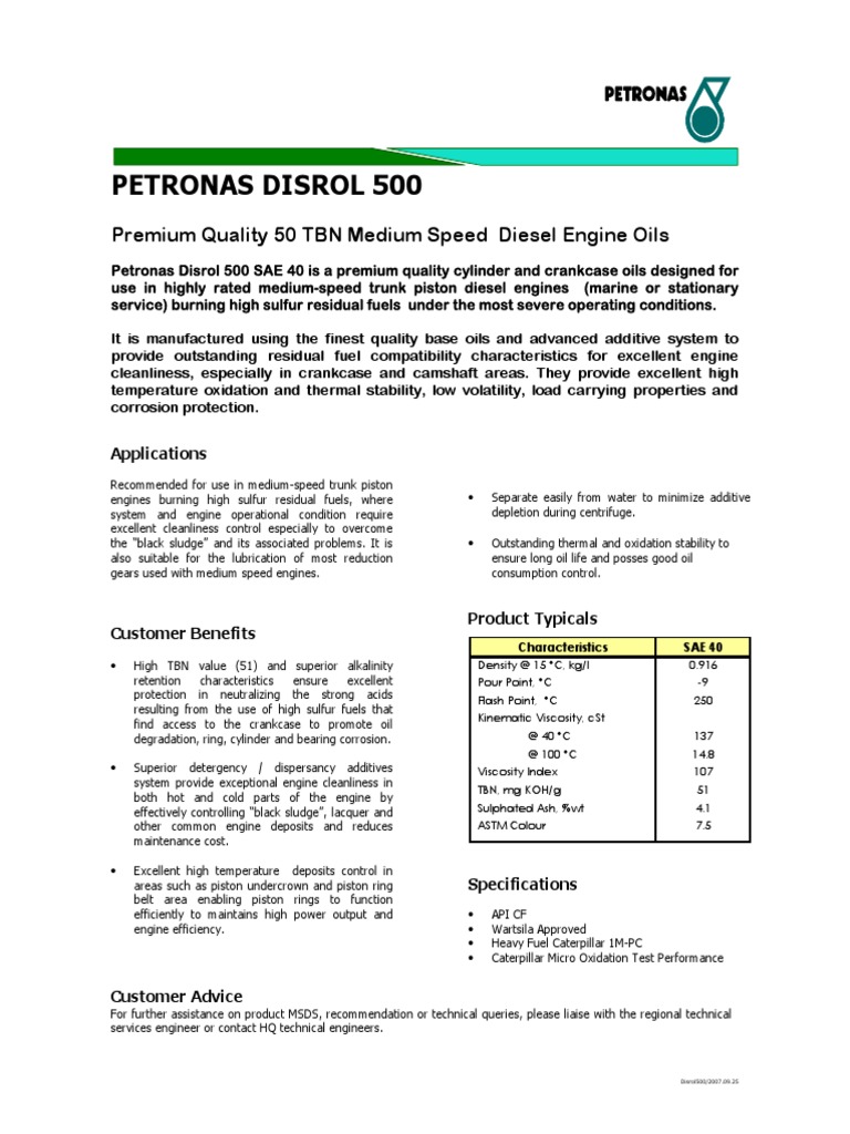 Petronas Disrol 500 SAE 40 is a premium quality cylinder and crankcase oils designed for