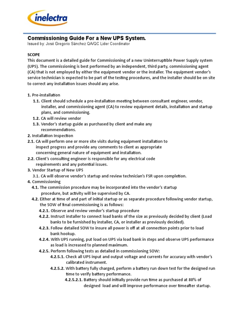 (UPS). The commissioning is best performed by an independent, third party, commissioning agent