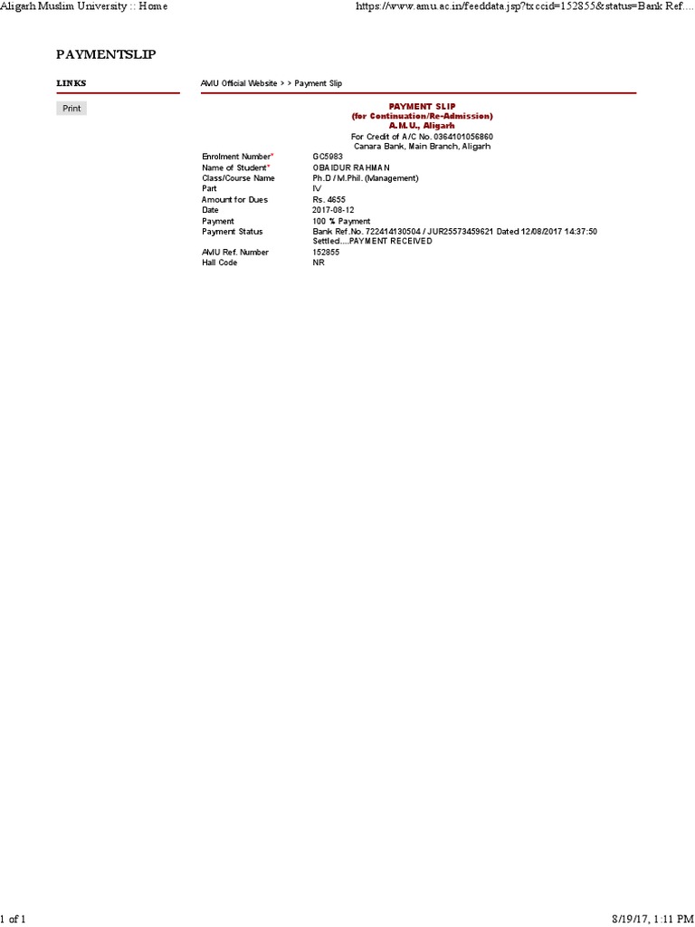 LINKS AMU Official Website > > Payment Slip