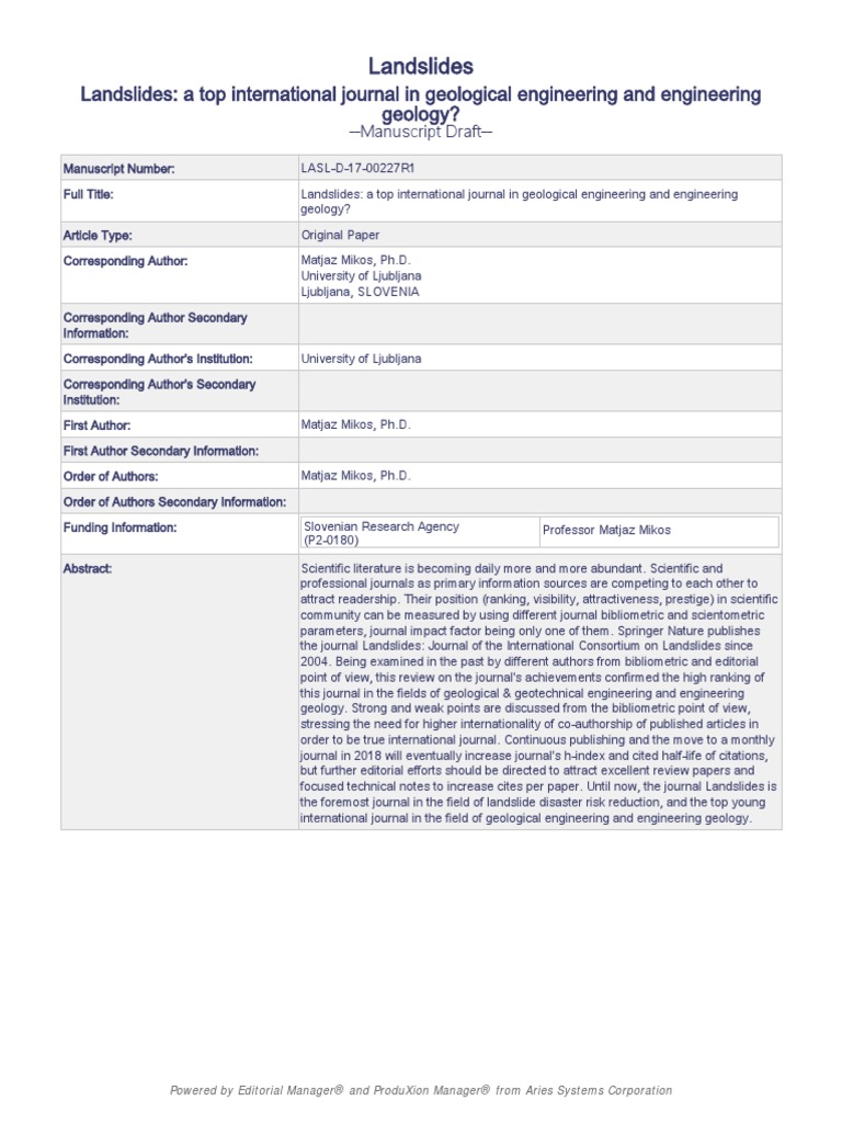 Full Title: Landslides: a top international journal in geological engineering and engineering