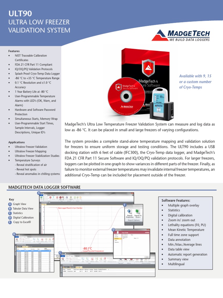 • User-Programmable Start Times, MadgeTech’s Ultra Low Temperature Freezer Validation System can measure and log data as