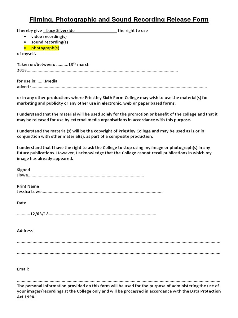 Filming, Photographic and Sound Recording Release Form