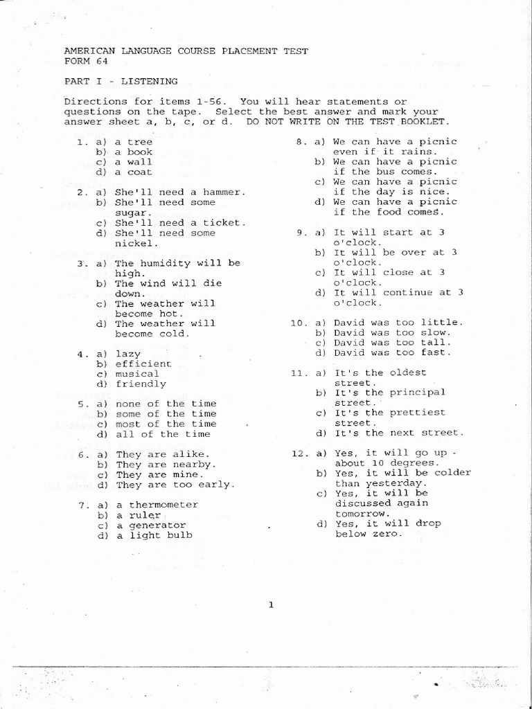 AMERICAN LANGUAGE COURSE PLACEMENT TEST