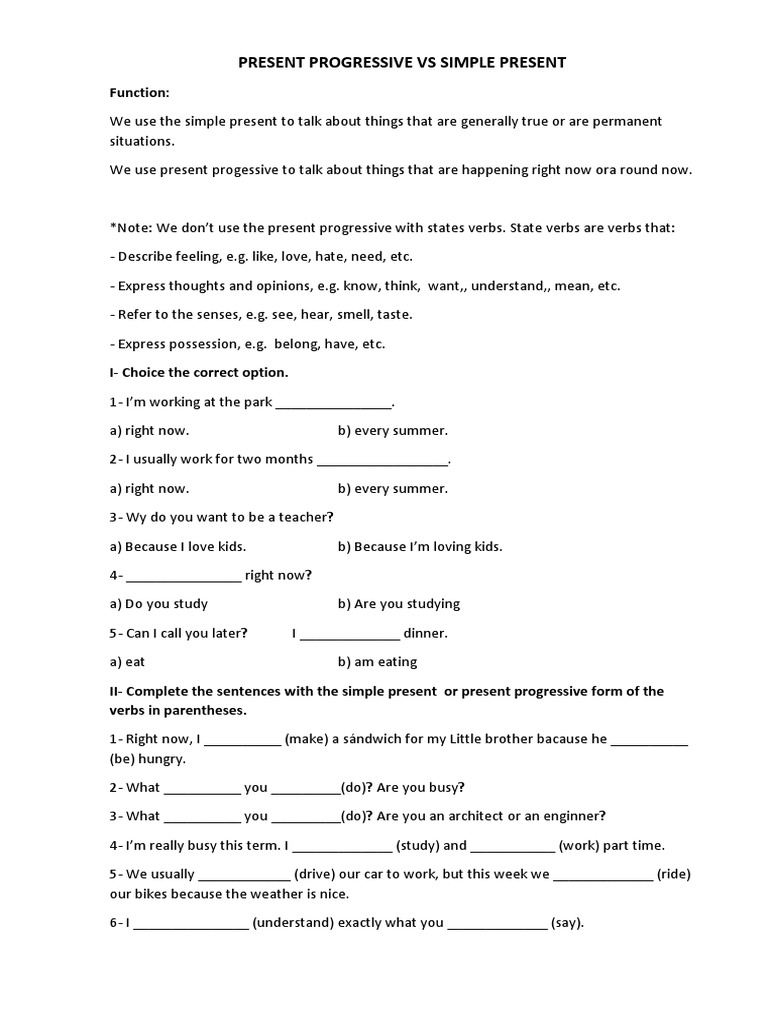 II- Complete the sentences with the simple present or present progressive form of the