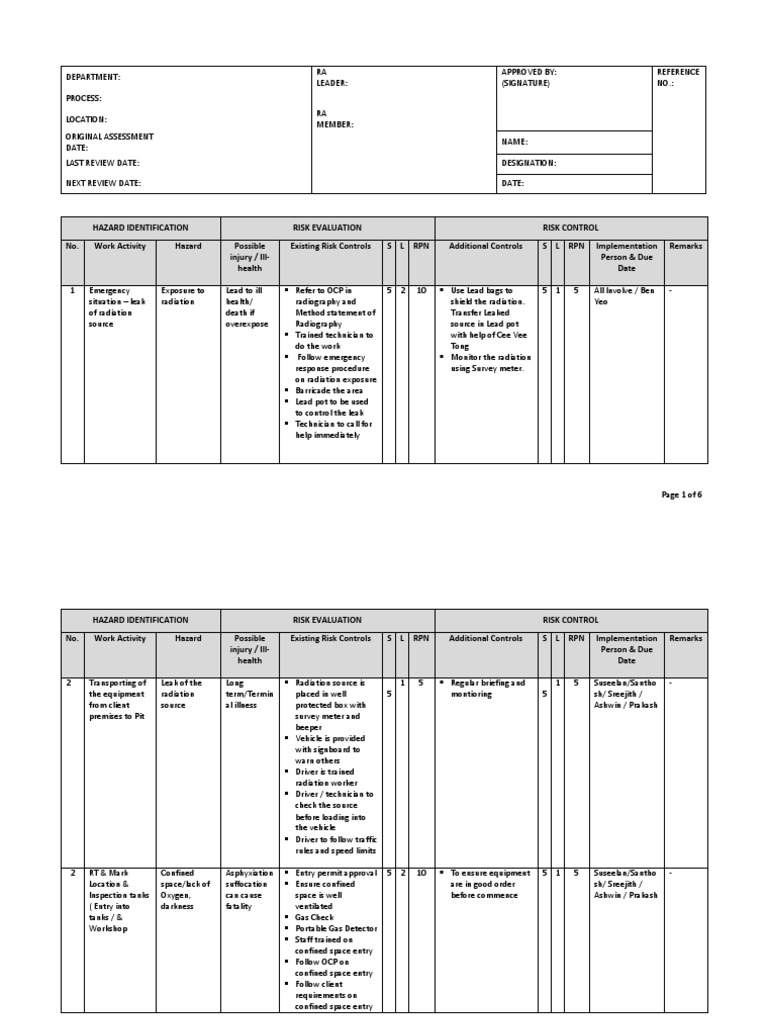No. Work Activity Hazard Possible Existing Risk Controls S L RPN Additional Controls S L RPN Implementation Remarks