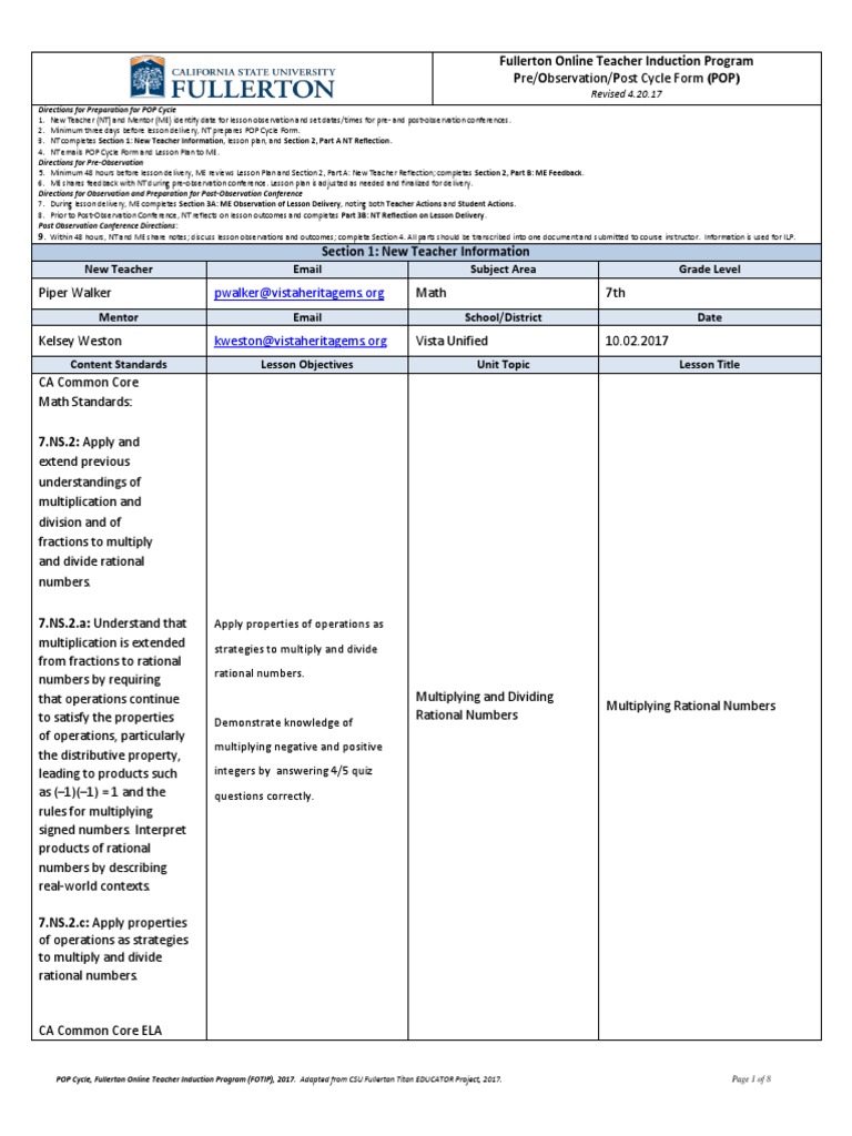 POP Cycle, Fullerton Online Teacher Induction Program (FOTIP), 2017. Adapted from CSU Fullerton Titan EDUCATOR Project, 2017. Page 1 of 8