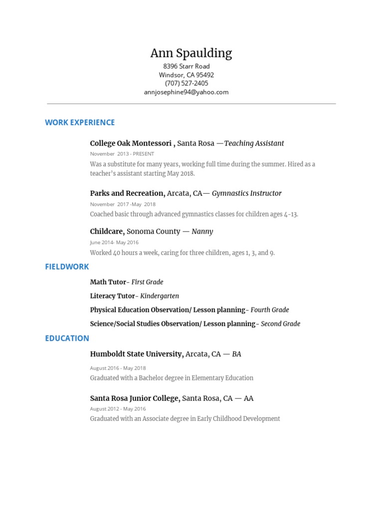 teacher’s assistant starting May 2018.