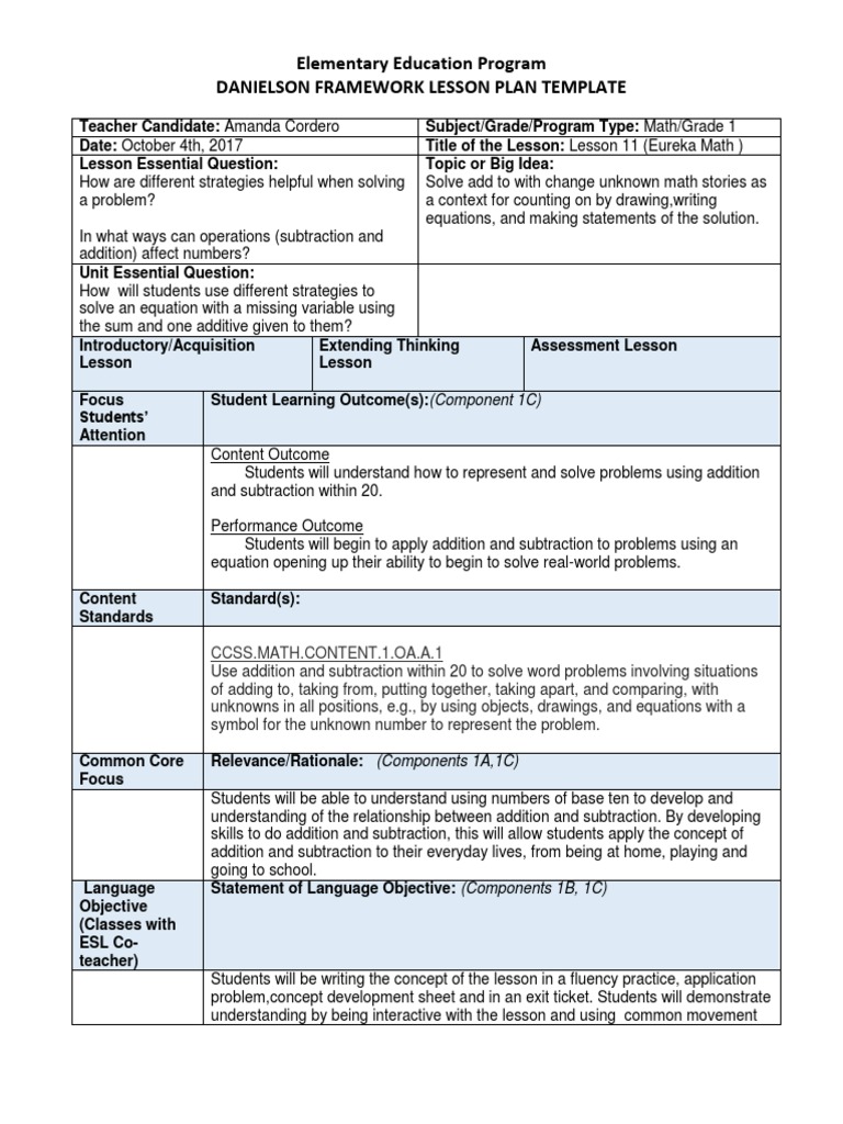 DANIELSON FRAMEWORK LESSON PLAN TEMPLATE