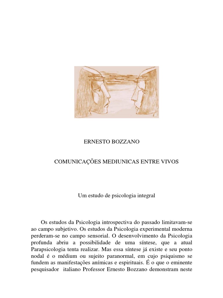 entre vivos, demonstra que o psiquismo independente da criatura humana é o mesmo e age da mesma maneira nos fenômenos anímicos (ou mentais, como são hoje classificados) e nos fenômenos espíritas. Vai além, demonstrando que a simples admissão do extra-- sensorial prova que o psiquismo humano não pode ser reduzido às funções orgânicas. Se pudermos ter percepções e comunicar-nos sem o intermediário habitual dos sentidos físicos é porque não somos somente materiais. Mas não é apenas a conclusão lógica que pesa na balança. Bozzano, cujo espírito científico é inegável e dos mais penetrantes, não se contentaria somente com deduções e induções. Por isso nos mostra o argumento irrefutável dos fatos, em que sempre se apoiou. Não se trata, pois, de um simples debate em torno de hipóteses a favor ou contra. O que temos neste livro é uma exposição de fatos, e a que somente os cegos não vêem, de fatos que se repetem incessantemente por toda parte e em todos os tempos. Assim, o lançamento da primeira tradução deste livro em português é uma contribuição valiosa e necessária ao desenvolvimento atual dos estudos da fenomenologia paranormal, particularmente no Brasil, que vem sofrendo o impacto de campanhas sistemáticas e interesseiras de desmoralização desse importante campo da investigação científica. Muitas inteligências capazes ainda se acomodam no pressuposto ingênuo de que este é um problema de interpretação. Mas a realidade é bem outra. As interpretações constituem apenas a fumaça de camuflagem lançada pelos que não querem aceitar a evidência dos fatos, seja por uma questão de atitude (o que é anticientífico) ou de posição dogmática, materialista ou religiosa (o que é hoje culturalmente inaceitável). O problema que este livro coloca é de Ciência e por isso mesmo os dados que apresenta são objetivos. Já é tempo de se compreender que a prevenção mental é tão danosa para o avança do conhecimento quanto o foi no passado à prevenção emocional do fideísmo religioso. Querer saber se somos mais do que simples organismo material não é menos científico, nem menos digno ou menos inteligente do