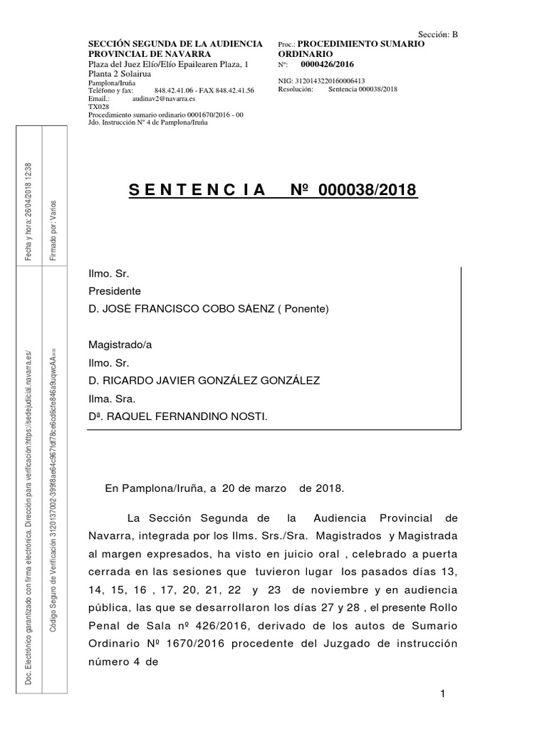 En Pamplona/Iruña, a 20 de marzo de 2018. La Sección Segunda de la Audiencia Provincial de Navarra, integrada por los Ilms. Srs./Sra. Magistrados y Magistrada al margen expresados, ha visto en juicio oral , celebrado a puerta cerrada en las sesiones que tuvieron lugar los pasados días 13, 14, 15, 16 , 17, 20, 21, 22 y 23 de noviembre y en audiencia pública, las que se desarrollaron los días 27 y 28 , el presente Rollo Penal de Sala nº 426/2016, derivado de los autos de Sumario Ordinario Nº 1670/2016 procedente del Juzgado de instrucción número 4 de Ilmo. Sr. Presidente D. JOS FRANCISCO COBO SENZ ( Ponente) Magistrado/a Ilmo. Sr. D. RICARDO JAVIER GONZÁLEZ GONZÁLEZ Ilma. Sra. Dª. RAQUEL FERNANDINO NOSTI.