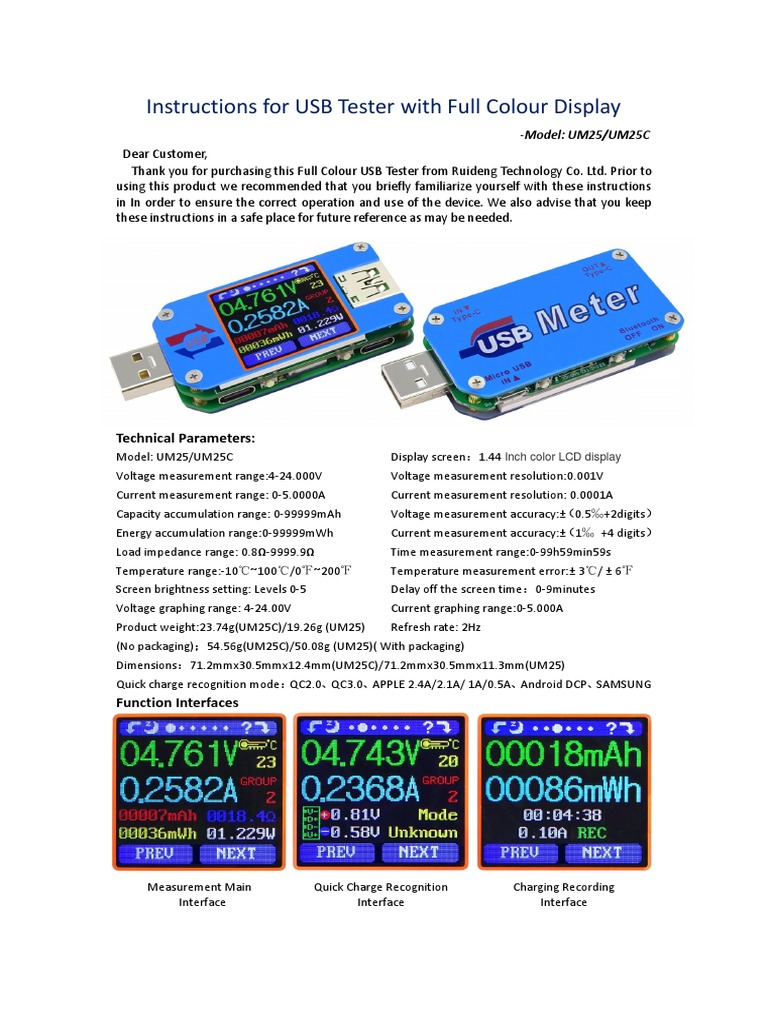 This document provides instructions for a full color USB tester with model UM25/UM25C. It details the technical specifications including voltage and current measurement ranges, accuracy, interfaces, functions, and layout. The instructions explain how to operate the various interfaces for measurement, quick charge recognition, data recording, graphing, and setting parameters.