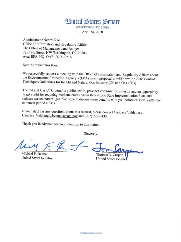 U.S. Senators Michael Bennet (D-CO) and Tom Carper (D-DE) sent a letter to the Office of Information and Regulatory Affairs requesting a meeting to discuss the oil and natural gas industry g…Full description