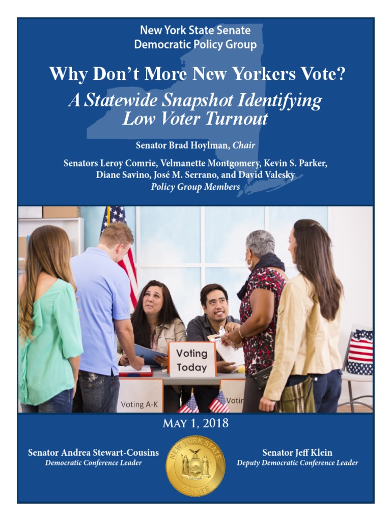 The Senate Democratic Conference conducted a statewide survey of eligible voters to help determine the source of such low turnout. The results provide a snapshot of reasons voters chose not to go to the polls and point towards legislative solutions to address the problem. The voter survey identified major barriers in New York that discouraged voters from casting their ballots. Respondents named the inability to vote early or easily by absentee ballots in New York as a major impediment. In addition, respondents also cited a lack of awareness among voters of the dates of elections or the timing requirements to register to vote. The voter survey showed that there are particularly difficult barriers for voters to overcome in party primaries. In New York, voters must navigate complicated laws about when to register to vote, enroll in a party, and even when to cast their ballots. Changing party enrollment to