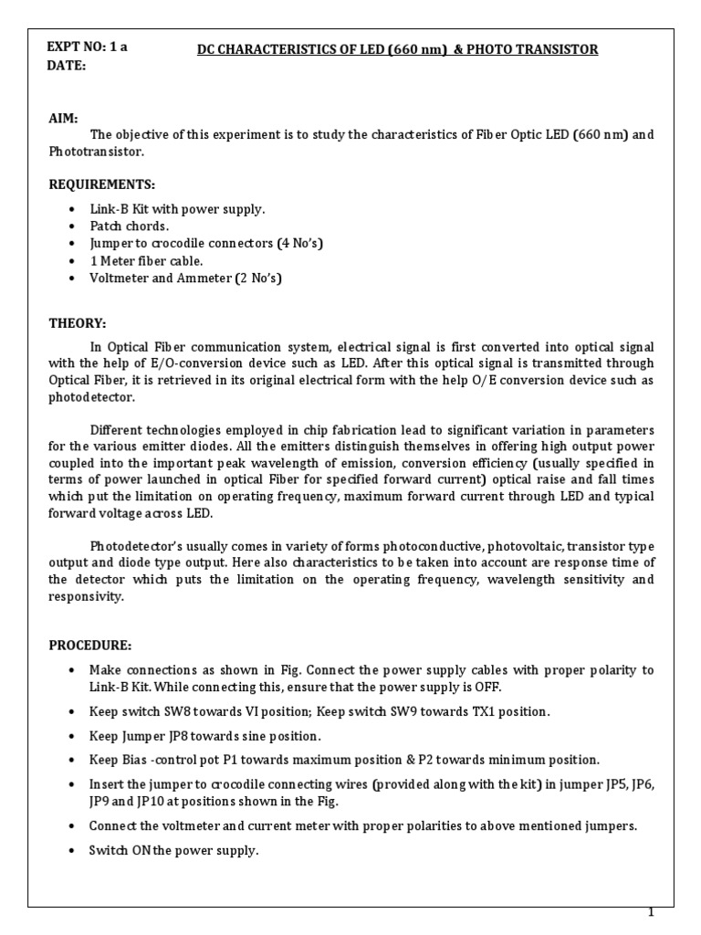 EXPT NO: 1 b DC CHARACTERISTICS OF LED (850 nm) & PIN-PHOTODIODE