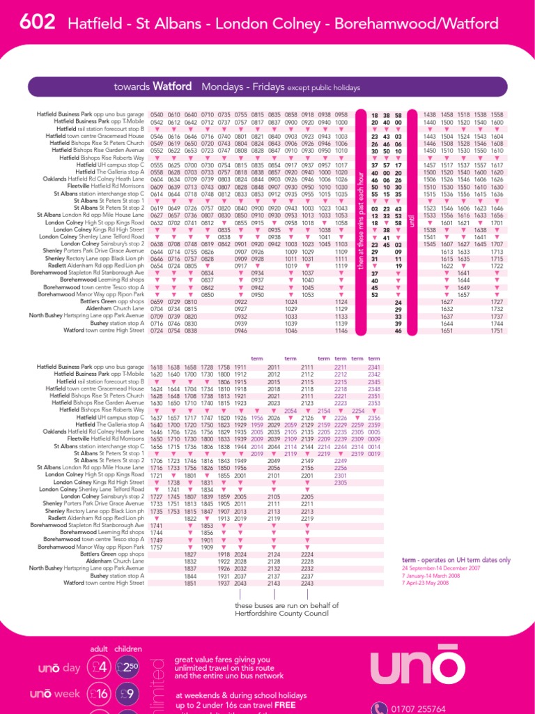 Hatfield Business Park uno bus garage 0845 0915 0943 1013 1043 13 43 1643 1730 1800 1830 1905 1932 2007 2035 2135