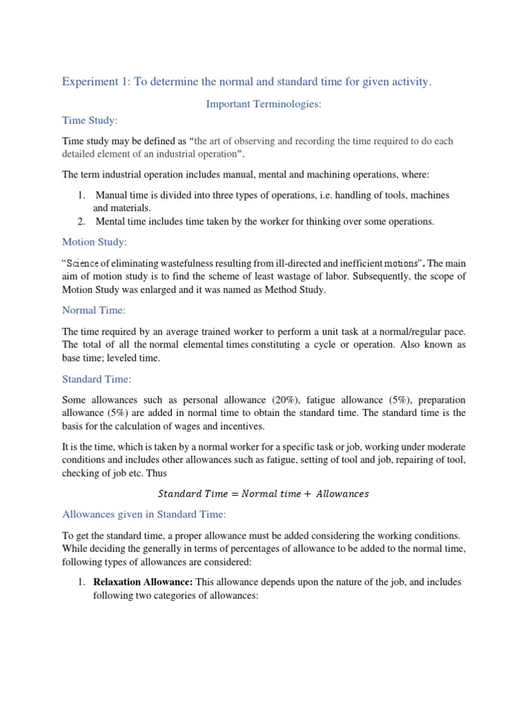 allowance (5%) are added in normal time to obtain the standard time. The standard time is the