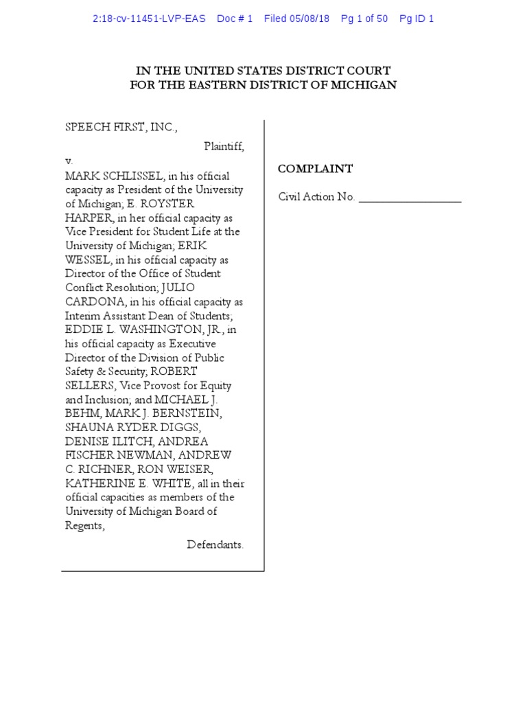 - 2 - Plaintiff Speech First, Inc. brings this action under the First and Fourteenth Amendments to the United States Constitution against Defendants for declaratory and injunctive relief and alleges as follows.