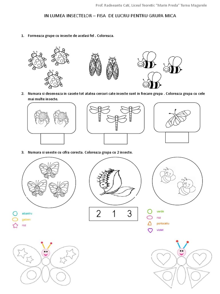 3. Numara si uneste cu cifra corecta. Coloreaza grupa cu 2 insecte.