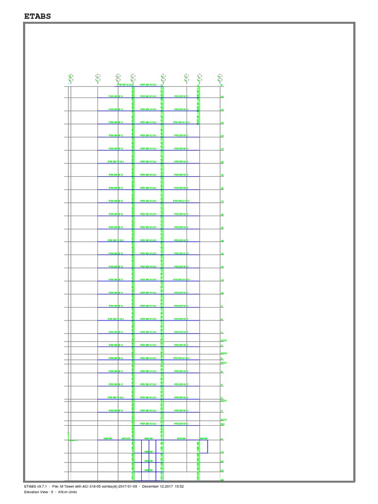 This document appears to be a report from ETABS software showing an elevation view of a tower structure. The report includes the version of ETABS used, the file name which references a tower structure designed using ACI 318-05 code combinations, and the date and time the report was generated.