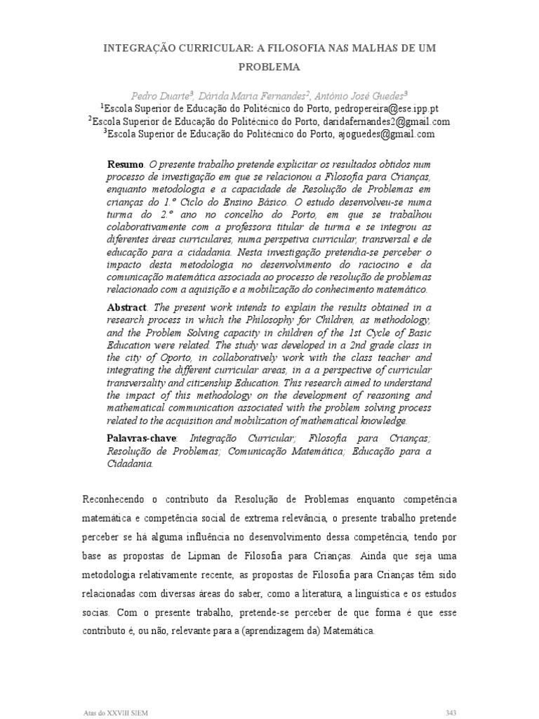 Palavras-chave: Integração Curricular; Filosofia para Crianças;