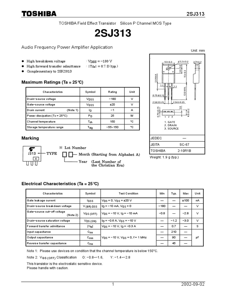 Note 2: VGS (OFF) Classification O: −0.8~−1.6, Y: −1.4~−2.8