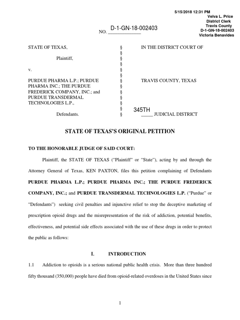 1 NO. ______________ STATE OF TEXAS, § IN THE DISTRICT COURT OF § Plaintiff, § § v. § § PURDUE PHARMA L.P.; PURDUE § TRAVIS COUNTY, TEXAS PHARMA INC.; THE PURDUE § FREDERICK COMPANY, INC.; and § PURDUE TRANSDERMAL § TECHNOLOGIES L.P., § § Defendants