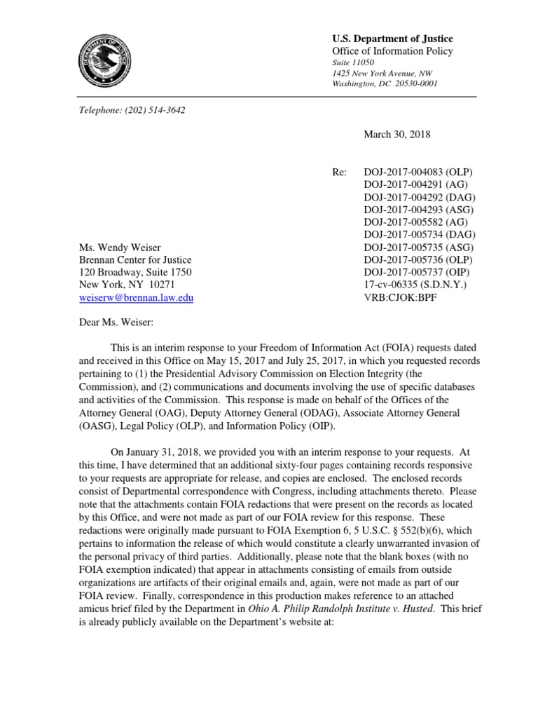 FOIA Response From DOJ's Office of Information Policy About The Presidential Advisory Commission On Election Integrity - March 30, 2018