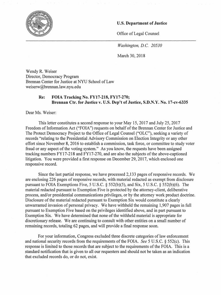FOIA Response From DOJ's Office of Legal Counsel About The Presidential Advisory Commission On Election Integrity - March 30, 2018