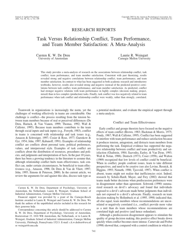 also Amason, 1996; De Dreu, 1997; De Dreu & Weingart, 2003; cation of the pioneering study by Jehn (1994) and ends with the