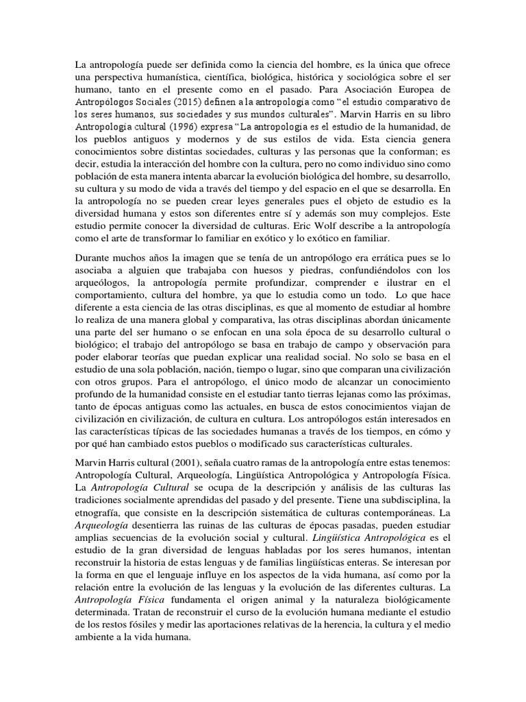 humano, tanto en el presente como en el pasado. Para Asociación Europea de Antropólogos Sociales (2015) definen a la antropología como “el estudio comparativo de los seres humanos, sus sociedades y sus mundos culturales”. Marvin Harris en su libro Antropología cultural (1996) expresa “La antropología es el estudio de la humanidad, de los pueblos antiguos y modernos y de sus estilos de vida. Esta ciencia genera conocimientos sobre distintas sociedades, culturas y las personas que la conforman; es decir, estudia la interacción del hombre con la cultura, pero no como individuo sino como población de esta manera intenta abarcar la evolución biológica del hombre, su desarrollo, su cultura y su modo de vida a través del tiempo y del espacio en el que se desarrolla. En la antropología no se pueden crear leyes generales pues el objeto de estudio es la diversidad humana y estos son diferentes entre sí y además son muy complejos. Este estudio permite conocer la diversidad de culturas. Eric Wolf describe a la antropología como el arte de transformar lo familiar en exótico y lo exótico en familiar. Durante muchos años la imagen que se tenía de un antropólogo era errática pues se lo asociaba a alguien que trabajaba con huesos y piedras, confundiéndolos con los arqueólogos, la antropología permite profundizar, comprender e ilustrar en el comportamiento, cultura del hombre, ya que lo estudia como un todo. Lo que hace diferente a esta ciencia de las otras disciplinas, es que al momento de estudiar al hombre lo realiza de una manera global y comparativa, las otras disciplinas abordan únicamente una parte del ser humano o se enfocan en una sola época de su desarrollo cultural o biológico; el trabajo del antropólogo se basa en trabajo de campo y observación para poder elaborar teorías que puedan explicar una realidad social. No solo se basa en el estudio de una sola población, nación, tiempo o lugar, sino que comparan una civilización con otros grupos. Para el antropólogo, el único modo de alcanzar un conocimiento profundo de la humanidad consiste en el estudiar tanto tierras lejanas como las próximas, tanto de épocas antiguas como las actuales, en busca de estos conocimientos viajan de civilización en civilización, de cultura en cultura. Los antropólogos están interesados en las características típicas de las sociedades humanas a través de los tiempos, en cómo y por qué han cambiado estos pueblos o modificado sus características culturales. Marvin Harris cultural (2001), señala cuatro ramas de la antropología entre estas tenemos: Antropología Cultural, Arqueología, Lingüística Antropológica y Antropología Física. La Antropología Cultural se ocupa de la descripción y análisis de las culturas las tradiciones socialmente aprendidas del pasado y del presente. Tiene una subdisciplina, la etnografía, que consiste en la descripción sistemática de culturas contemporáneas. La Arqueología desentierra las ruinas de las culturas de épocas pasadas, pueden estudiar amplias secuencias de la evolución social y cultural. Lingüística Antropológica es el estudio de la gran diversidad de lenguas habladas por los seres humanos, intentan reconstruir la historia de estas lenguas y de familias lingüísticas enteras. Se interesan por la forma en que el lenguaje influye en los aspectos de la vida humana, así como por la relación entre la evolución de las lenguas y la evolución de las diferentes culturas. La Antropología Física fundamenta el origen animal y la naturaleza biológicamente determinada. Tratan de reconstruir el curso de la evolución humana mediante el estudio de los restos fósiles y medir las aportaciones relativas de la herencia, la cultura y el medio ambiente a la vida humana.