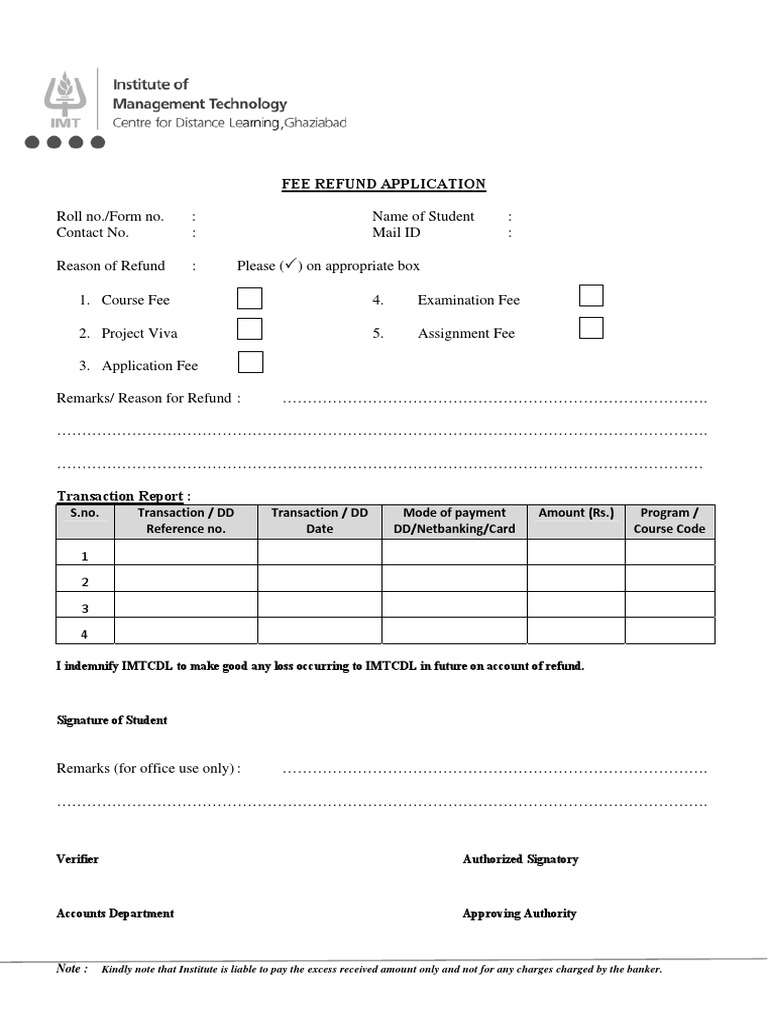 Note : Kindly note that Institute is liable to pay the excess received amount only and not for any charges charged by the banker.