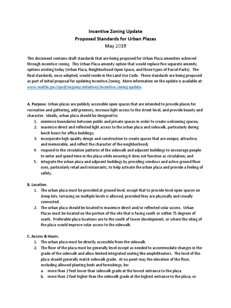 This document contains draft standards that are being proposed for Urban Plaza amenities achieved through incentive zoning. This Urban Plaza amenity option that would replace five separate amenity options existing today (Urban Plaza, Neighborhood Open Space, and three types of Parcel Parks). The final standards, once adopted, would reside in the Land Use Code. These standards are being proposed as part of initial proposal for updating Incentive Zoning. More information on the update is available at: www.seattle.gov/opcd/ongoing-initiatives/incentive-zoning-update.