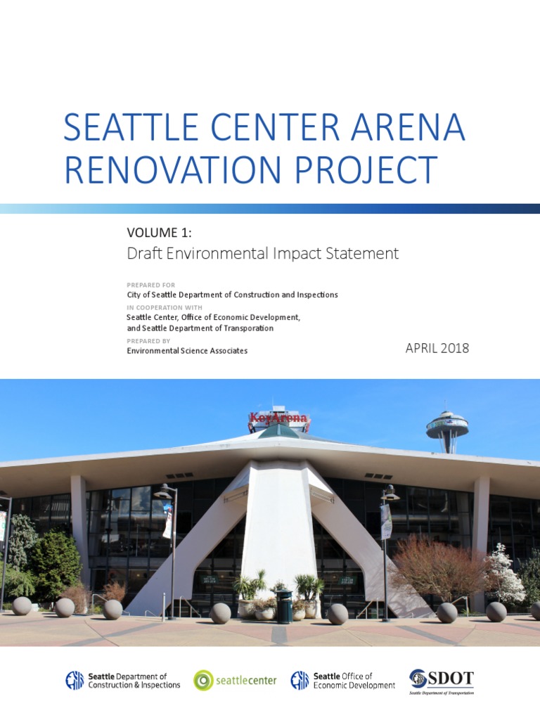 April 23, 2018 Seattle Center Arena Renovation Project Draft Environmental Impact Statement Dear Affected Agencies, Organizations, and Interested Parties: The City of Seattle (City) is proposing to renovate the existing KeyArena at Seattle Center to provide a modern multi-purpose entertainment and sports center that will host concerts, sporting events, family shows, community-oriented events, and numerous other events, and that could accommodate a professional National Hockey League (NHL) and/or National Basketball Association (NBA) franchise. The proposal would also continue to accommodate current uses including the Seattle Storm Women’s National Basketball Association (WNBA) franchise. For the purposes of this EIS, the renovated arena is referred to as the “Seattle Center Arena.” The Seattle Department of Construction and Inspections (SDCI) is the Lead Agency under the State Environmental Policy Act (SEPA) for the proposal and has prepared this Draft Environmental Impact Statement (Draft EIS) to analyze potential environmental impacts resulting from the proposed renovation of KeyArena. Seattle Center, the Office of Economic Development (OED), and Seattle Department of Transportation (SDOT) are consulting agencies and partners in the EIS process for the Seattle Center Arena Renovation Project. The City proposes to enter into a lease and development agreement with a private developer, Oak View Group, LLC (OVG), who would design and obtain permits for the renovation and operation of the arena during the lease term. The scope of this Draft EIS has been determined in accordance with the Seattle SEPA Ordinance (SMC 25.05). A public notice was issued on September 7, 14, and 18, 2017, stating that the project would require an EIS and inviting public and agency comment on the scope of the Draft EIS. On September 28, 2017, a public meeting was held at Seattle Center to provide opportunity for the public to discuss and identify probable significant environmental impacts that should be addressed in the Draft EIS. A total of 41 comment letters and oral testimonies were received during the scoping period and were used by SCDI to inform the issues and alternatives evaluated in the Draft EIS. Three alternatives are analyzed in this Draft EIS, including the No Action Alternative, Alternative 1: The Oak View Group (OVG) Proposal, and Alternative 2: Modified Proposal. The Draft EIS describes the affected environment, potential impacts of the three alternatives, and mitigation measures for the following topics: land use, transportation, earth, historic and cultural resources, recreation, noise and vibration, visual resources, air quality and greenhouse gases, public services and utilities, plants, and cumulative impacts. Key environmental issues are primarily related to potential construction and operations impacts to traffic and transportation, as well as historic and cultural resources, noise and vibration, and visual resources. The City is requesting review and comment on this Draft EIS from members of the public, organizations, and local, state, and federal agencies. The City will consider all comments provided during the 45-day comment period on the Draft EIS, which ends on June 7, 2018. A public hearing will be held on May 14,