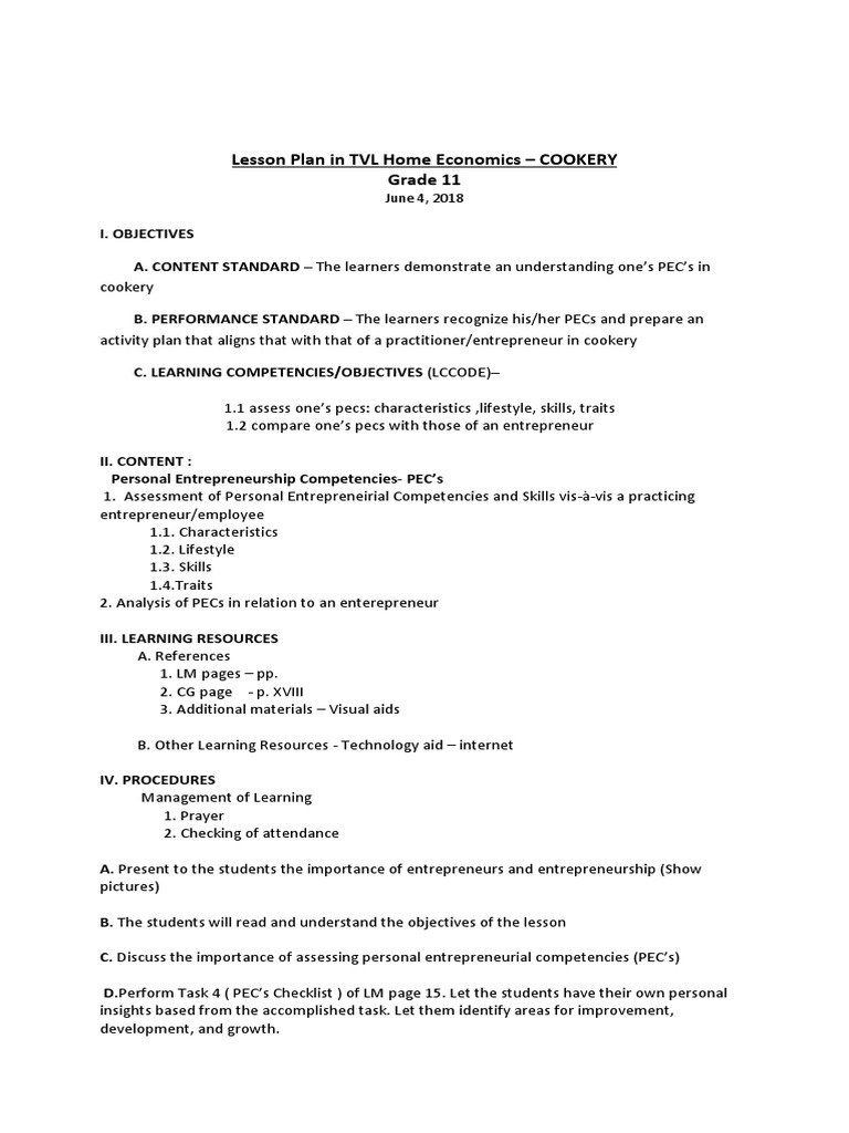 Lesson Plan in TVL Home Economics – COOKERY