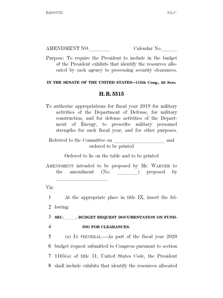 Purpose: To require the President to include in the budget of the President exhibits that identify the resources allo-cated by each agency to processing security clearances.