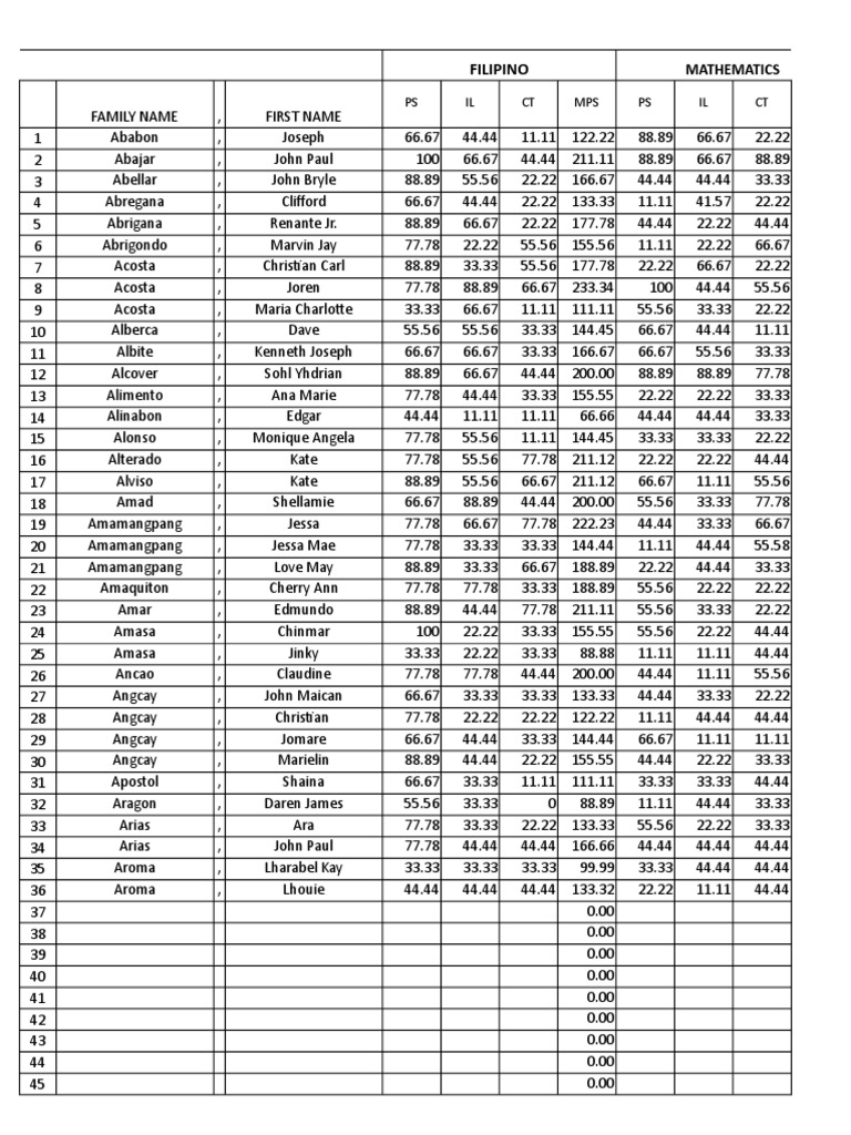 Filipino Mathematics Scores Overview