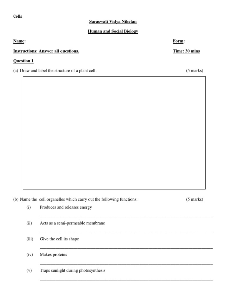 (a) Draw and label the structure of a plant cell. (5 marks)