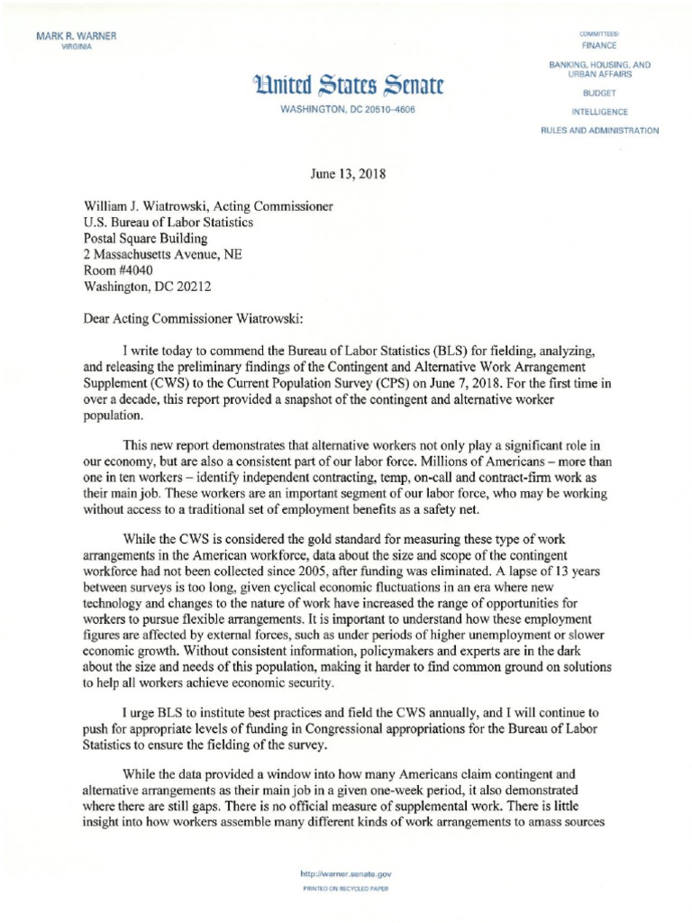 Today, U.S. Sen. Mark R. Warner (D-VA) sent a letter to Bureau of Labor Statistics (BLS) Acting Commissioner William Wiatrowski, urging the agency to conduct further research on the continge…Full description