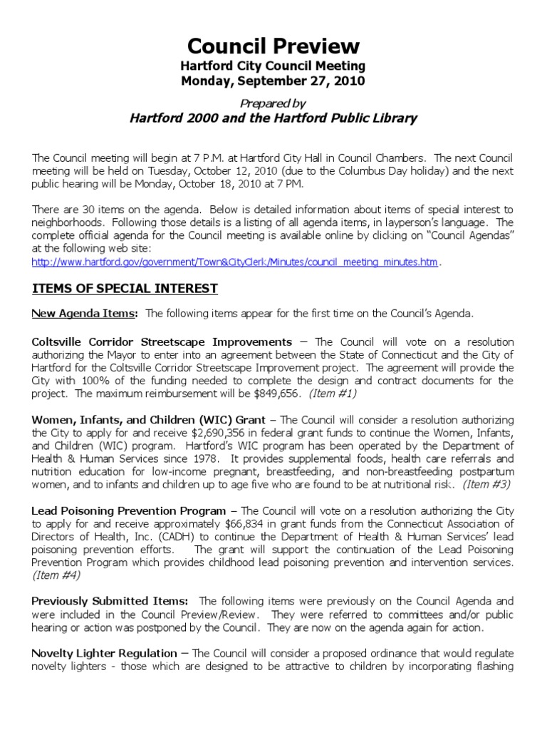 The next Council meeting will be held on Tuesday, October 12, 2010. There are 30 items on the agenda. The following items appear for the first time on the Council's agenda.