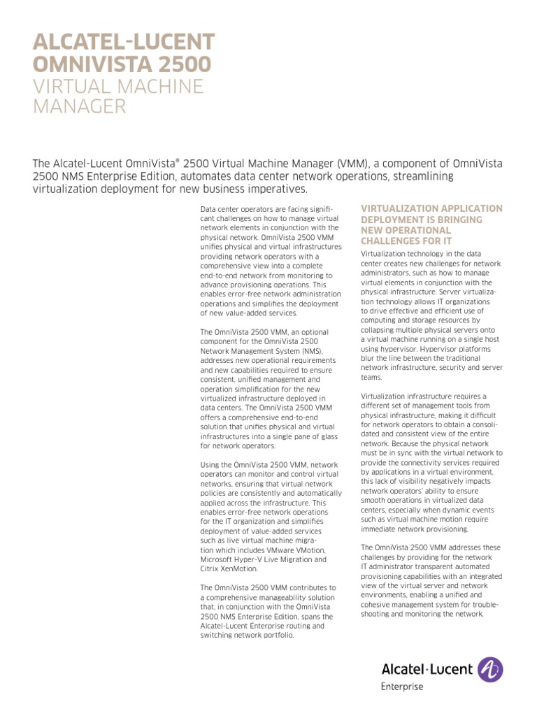 The Alcatel-Lucent OmniVista® 2500 Virtual Machine Manager (VMM), a component of OmniVista