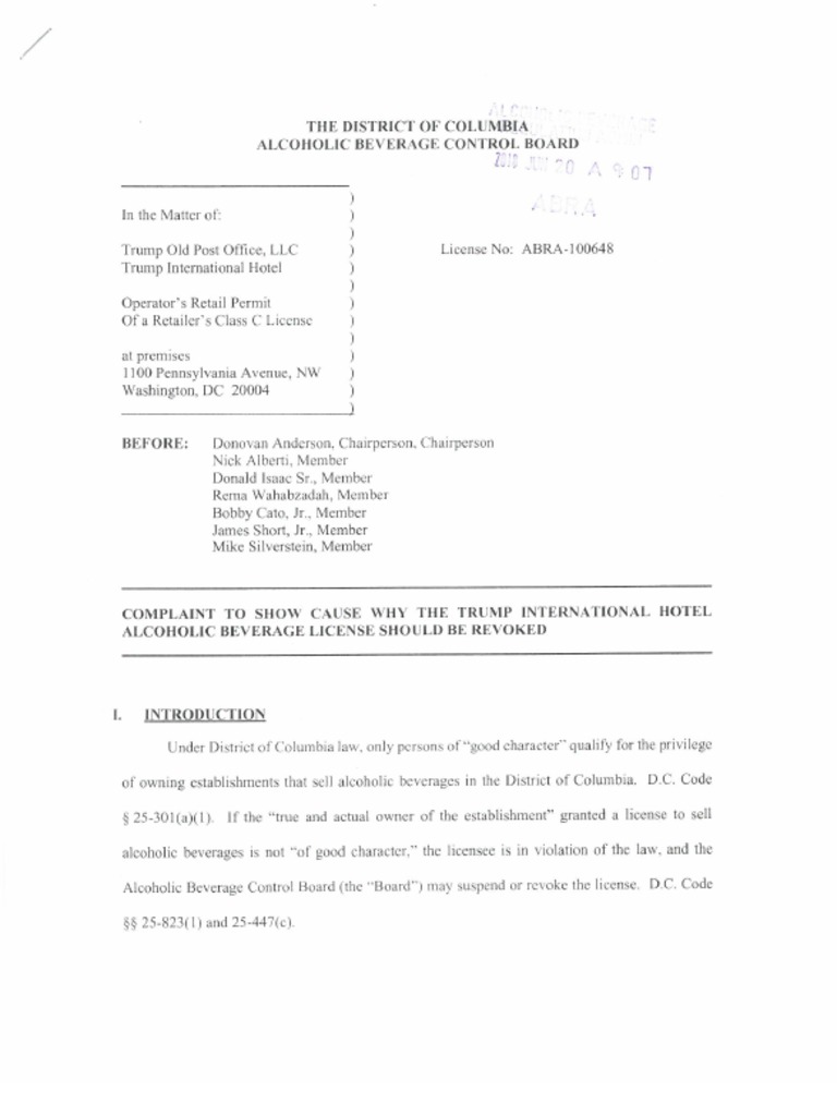 2018.06.20 Complaint To Request Hearing To Show Cause Why Liquor License Should Not Be Revoked