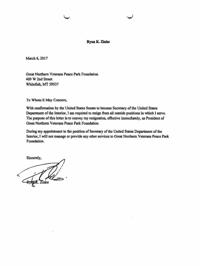 Interior Secretary Ryan Zinke's resignation letter from the Great Northern Veteran's Peace Park Foundation.